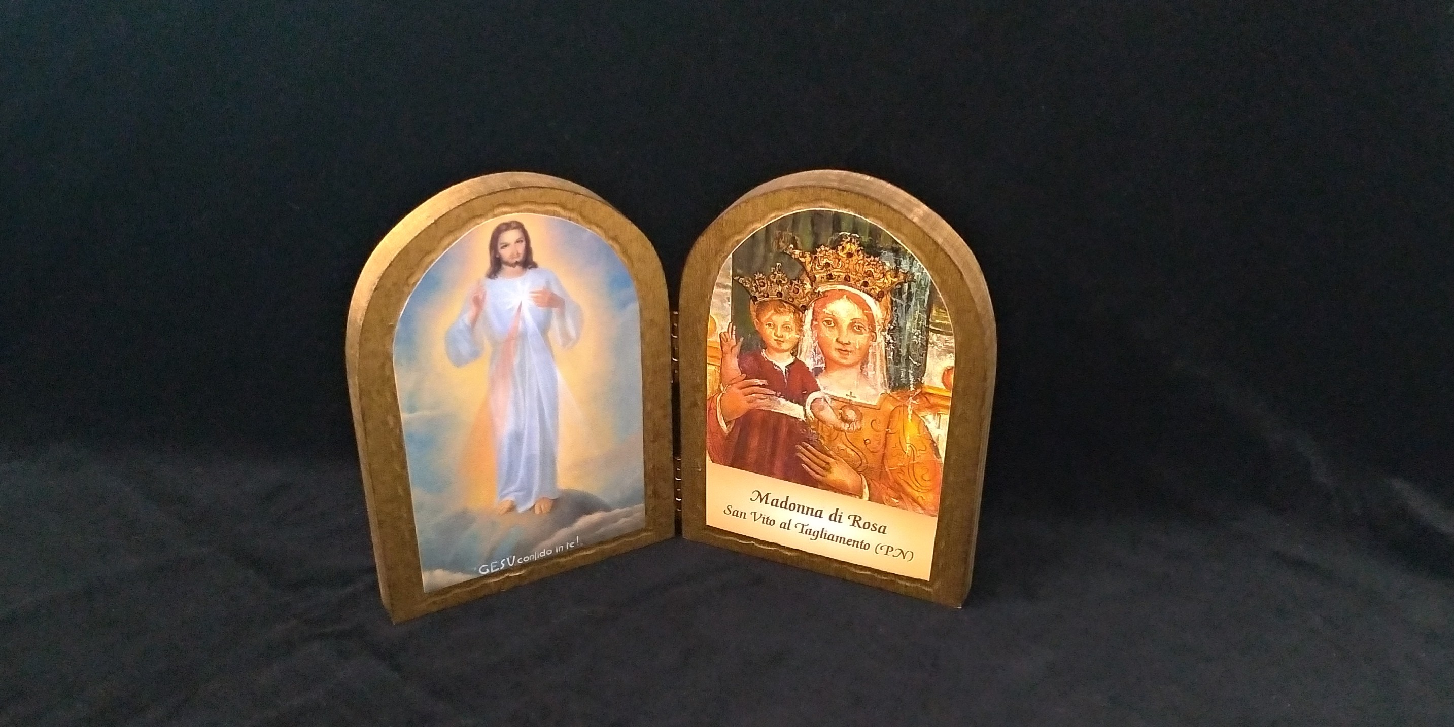 Dittico in legno, apertura a libro, con le immagini di Gesù Misericordioso e Madonna di Rosa.